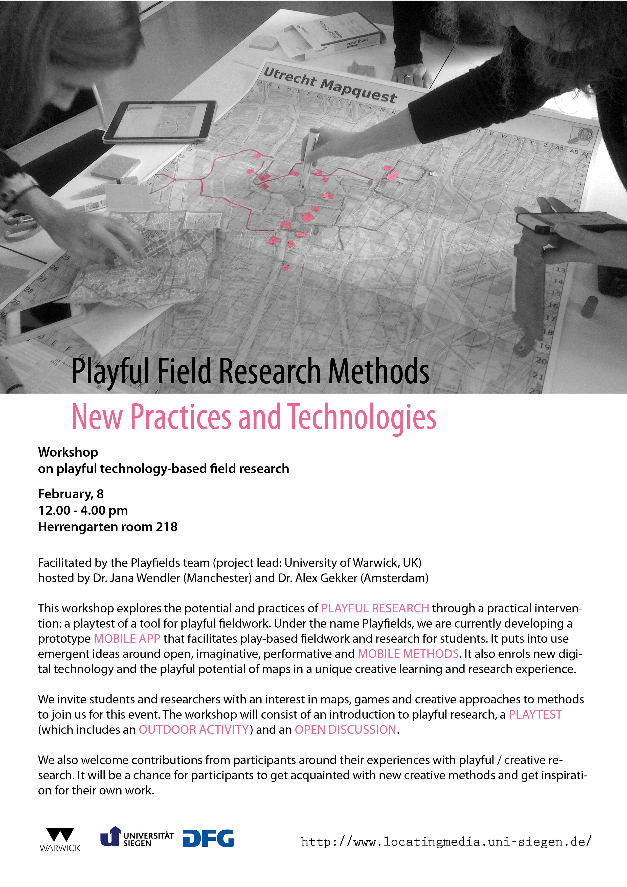 Am Mittwoch, 08. Februar 2017 ist das Playfields Team zu Gast am Herrengarten. Dr. Jana Wendler (Manchester) and Dr. Alex Gekker (Amsterdam) veranstalten einen Workshop zum Thema „Playful Field Research Methods“.
