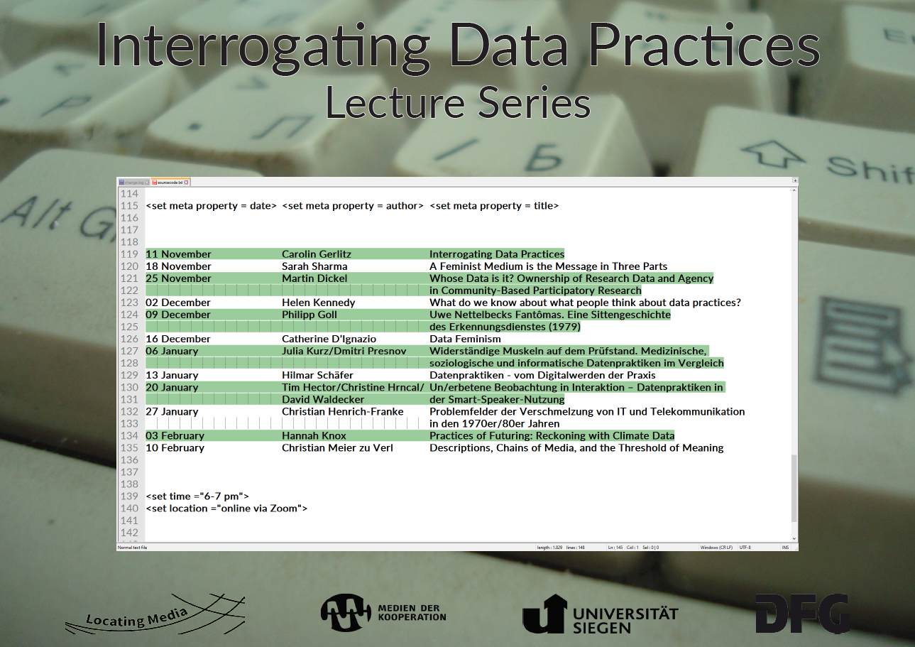 Die Ringvorlesung wird bis auf weiteres Digital abgehalten. Der Zoom-Link für die Vorlesung wird rechtzeitig über die Mailinglisten des SFB 1187 und von Locating Media zur Verfügung gestellt.